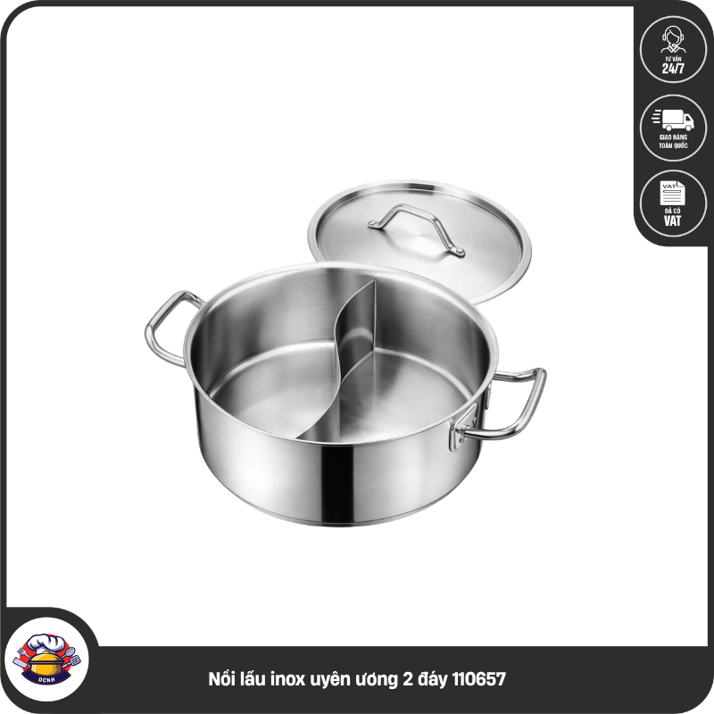 Nồi lẩu uyên ương 2 đáy 110657 là sự lựa chọn lý tưởng cho các nhà hàng chuyên phục vụ lẩu với quy mô bàn tiệc từ 2-3 người. Với thiết kế 2 ngăn tiện lợi và cấu trúc 2 đáy chắc chắn, sản phẩm giúp nhà hàng tối ưu hóa dịch vụ, cho phép thực khách thưởng thức cùng lúc hai hương vị lẩu khác nhau trên một chiếc nồi nhỏ gọn, thẩm mỹ.