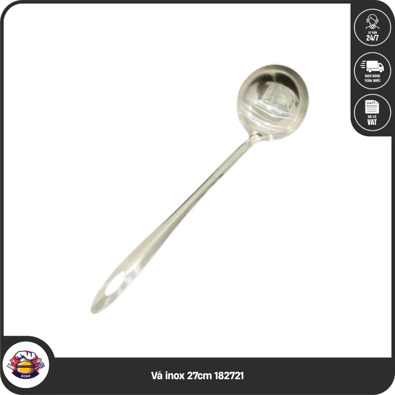 Vá inox 27cm (Mã 182721) là mẫu vá đặc (không lỗ) có kích thước trung bình, được thiết kế đặc biệt để phục vụ thực khách tại bàn. Với chất liệu inox sáng bóng và trọng lượng siêu nhẹ, sản phẩm mang lại cảm giác thoải mái khi sử dụng, giúp việc múc nước lẩu, soup hay nước sốt trở nên dễ dàng và sang trọng hơn.