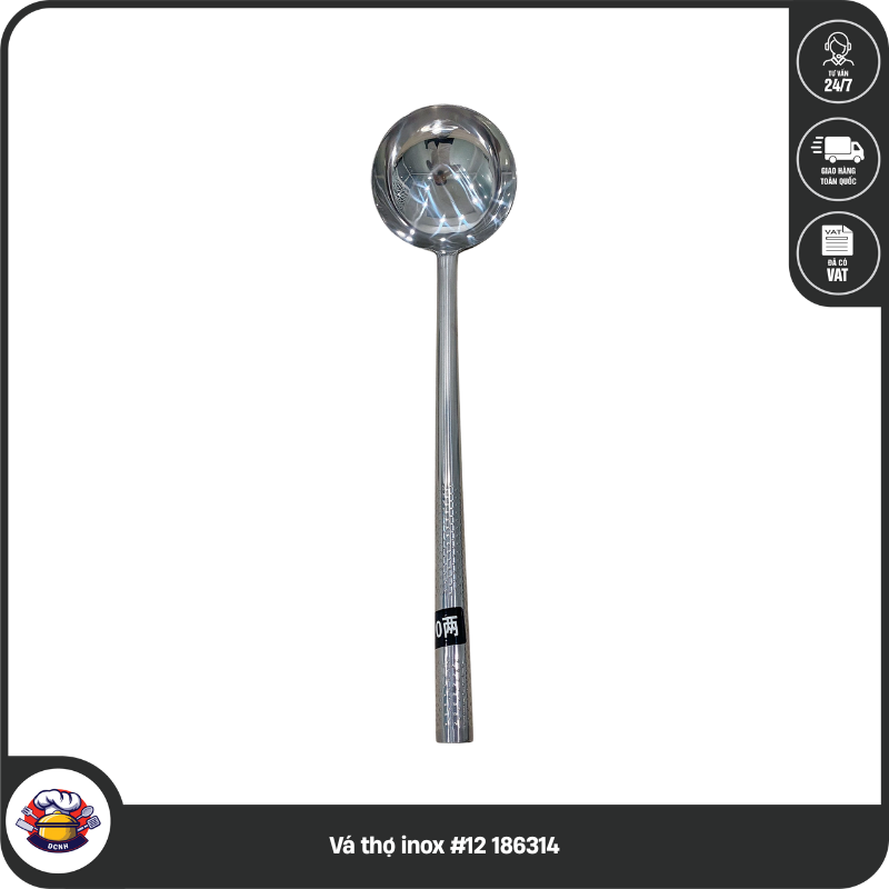 Khác với dòng cán gỗ, Vá thợ inox #12 (Mã 186314) được đúc và hàn nối hoàn toàn từ chất liệu thép không gỉ. Đây là sự lựa chọn hàng đầu cho các môi trường bếp yêu cầu tiêu chuẩn vệ sinh khắt khe và cường độ nấu nướng cực cao, nơi mà dụng cụ cần sự bền bỉ tuyệt đối trước va đập và nhiệt độ.